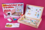 The game includes a wooden box, a blackboard, maker, chalks, and magnetic pieces. The magnetic pieces are grouped into different topics. The objective is to determine the relationship between the images and separate them into appropriate groups.